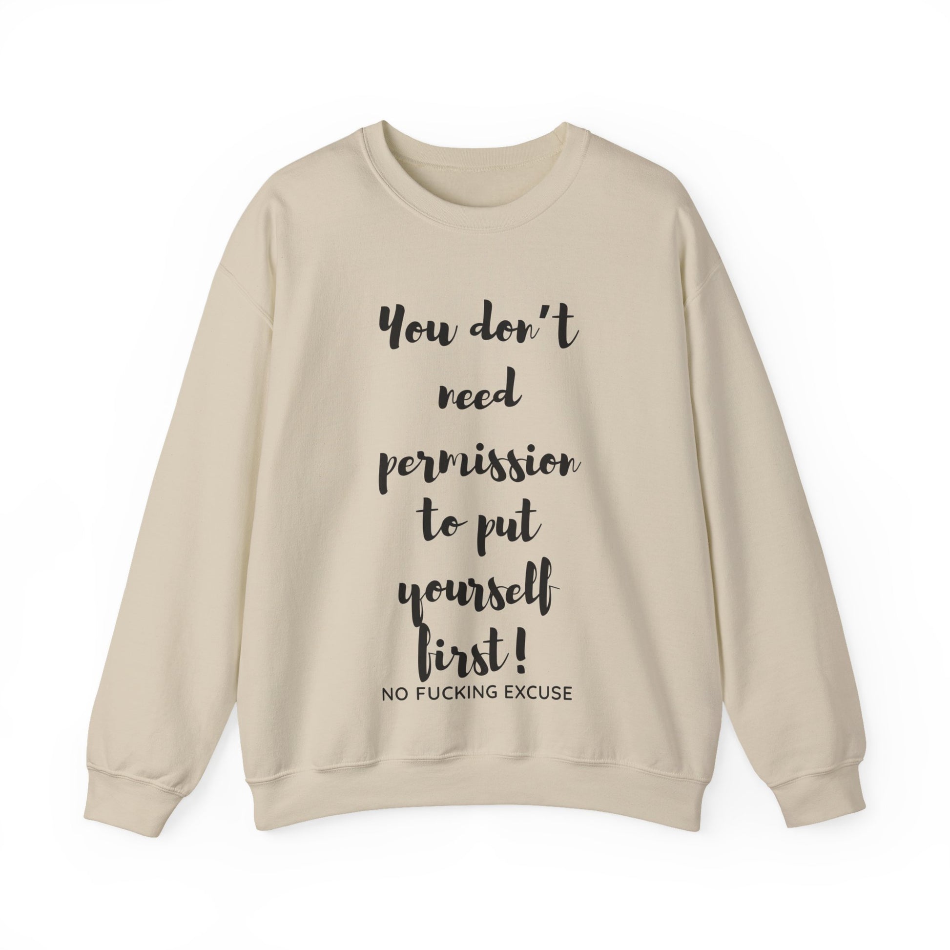 Elevate your cozy style and your mindset with our No Permission Needed to Put Yourself First Crewcut Sweatshirt. Designed for all genders, this unisex sweatshirt is a perfect blend of comfort, style, and empowerment—a wearable reminder that prioritizing yourself is always okay.